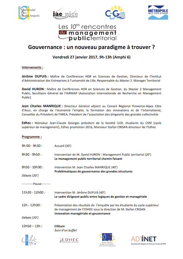 Ainsi, il convient dans un premier temps de s’interroger sur le périmètre est le rôle de la gouvernance. Les travaux de Larmarzelle (2011) ont mis en évidence la difficile catégorisation des relations entre le politique et l’administratif. Ce continuum « entre gris clair et gris foncé » laisse apparaître une gouvernance au périmètre à géométrie variable. Le rôle de cette gouvernance est également variable en fonction du nombre de participants et de la capacité interprétative de ces derniers à produire et appliquer les textes ainsi que les orientations des courants dominants au sein du management public. En deuxième lieu, il s’agit d’analyser la nature du lien entre la gouvernance et l’infrastructure. La relation entre le « top management » et le « middle management » constitue une vraie problématique compte tenu des changements observés autour et au sein de la fonction publique territoriale (Desmarais, 2008), pouvant introduire certains symptôme inquiétants (Codot, Cintas, 2013).