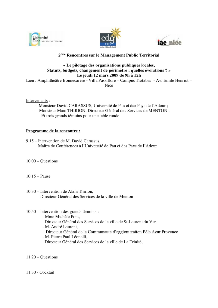 Telle est la problématique posée par David CARASSUS – Maître de conférence en sciences de gestion à l’IAE de l’Université de Pau et des Pays de l’Adour à l’occasion de la deuxième table ronde organisée par le CDG06 en partenariat avec les étudiants de Master 2 Management Public de l’IAE.